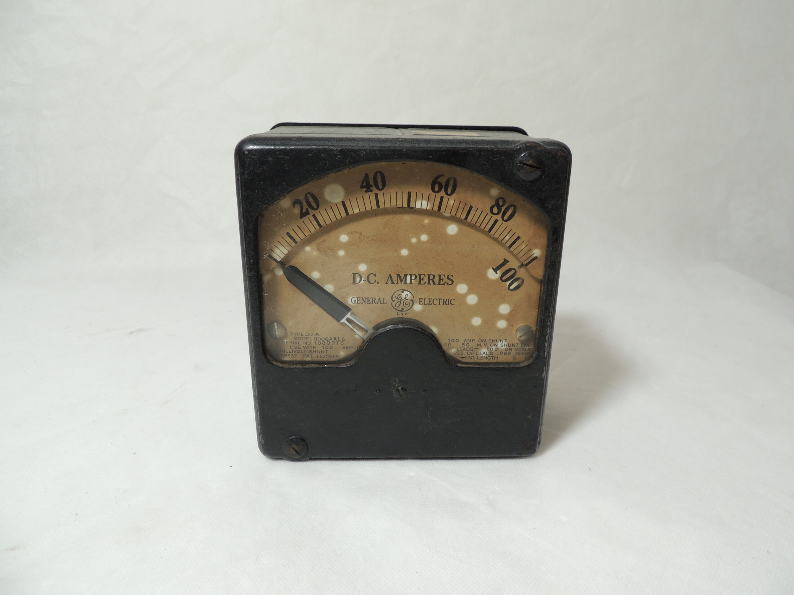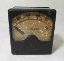 Amperímetro de corrente de ferro na cor preta, na parte frontal temos um vidro e uma agulha com as inscrições: "40-60 80-100 d.c. amperes - General Electric", atrás há dois grandes parafusos e o número de registro em branco, além de um adesivo com outra numeração em cima.