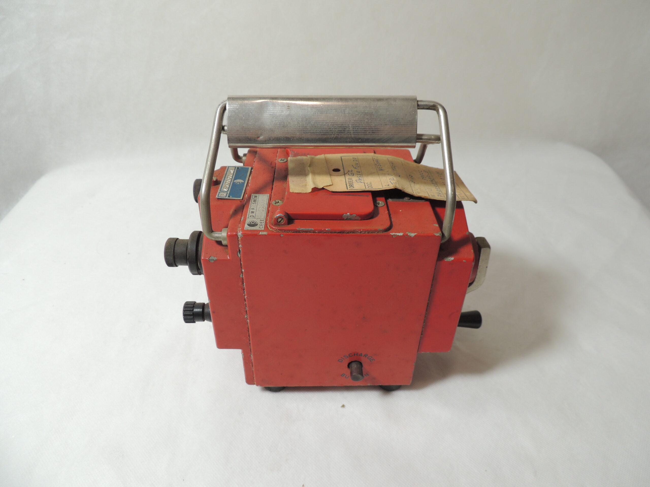 Trata-se de um medidor de altas resistências na cor vermelha, possui alça em metal e manivela na lateral também em metal, além disso, há uma ficha grudada com fita adesiva descrevendo o objeto com número de fabricação e até mesmo data, o objeto está acondicionado dentro de uma bolsa de couro.
